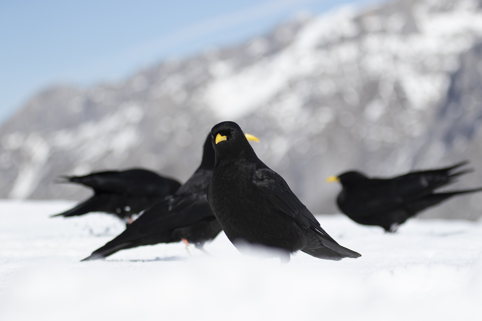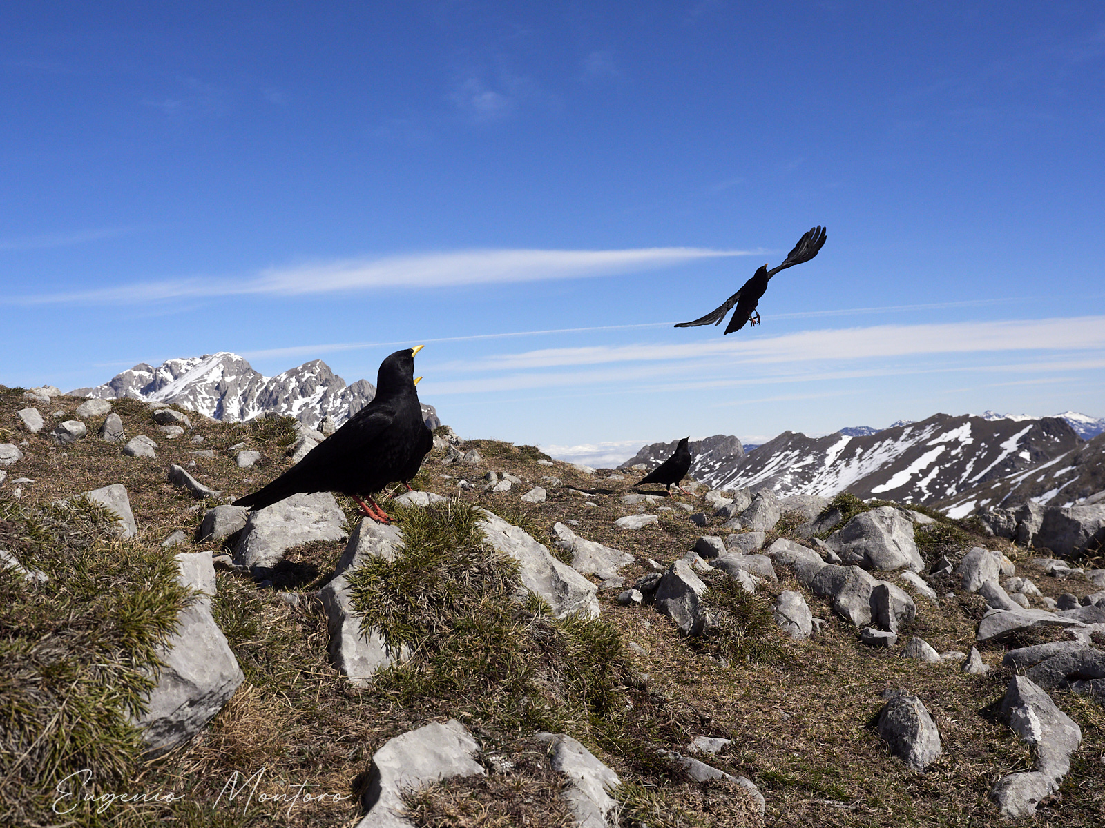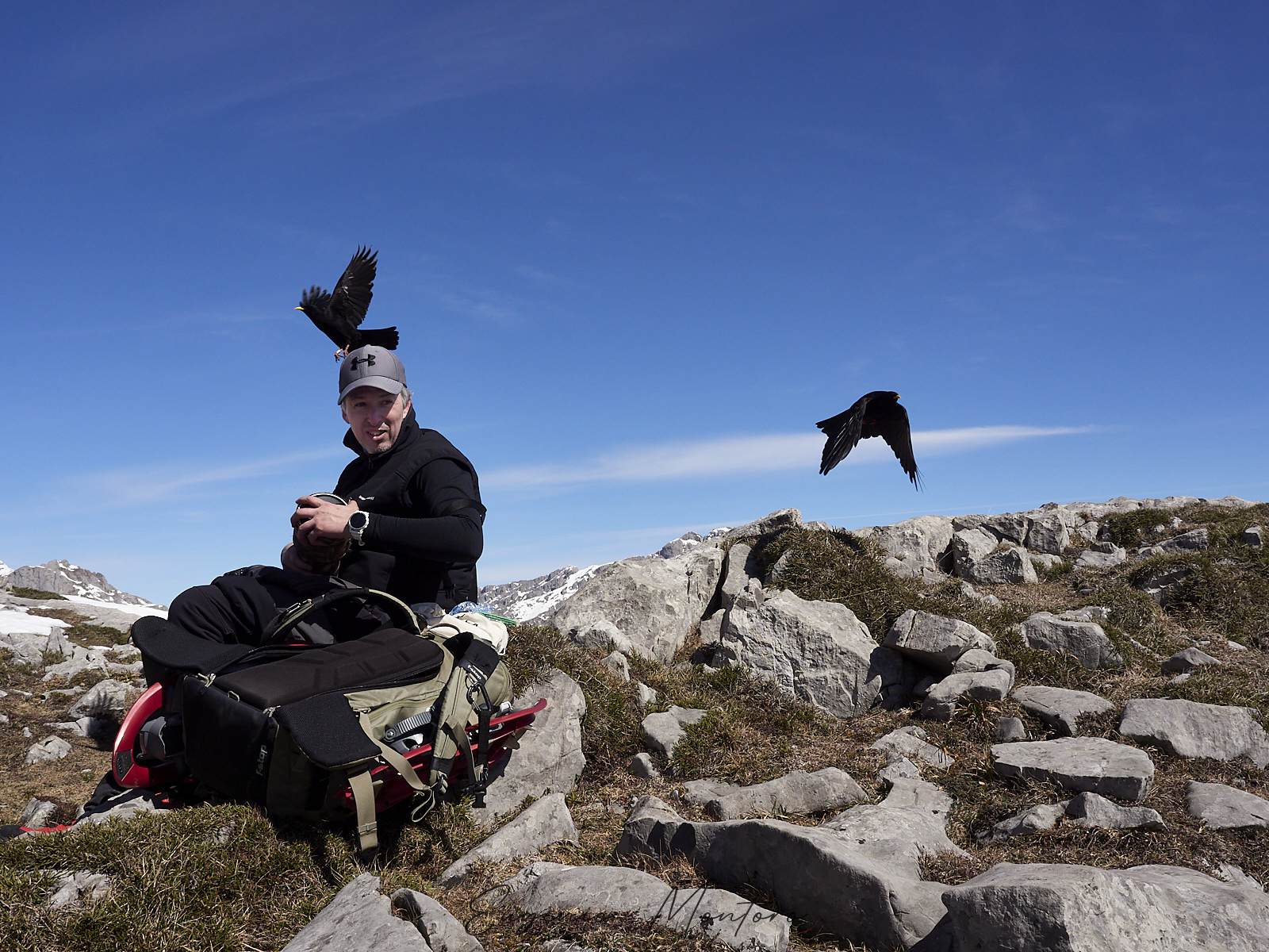 En cuanto sacamos los bocadillos a la hora de comer, las chovas piquigualdas aparecieron dando todo un espectáculo, de donde también sacamos mucho partido a las cámaras.