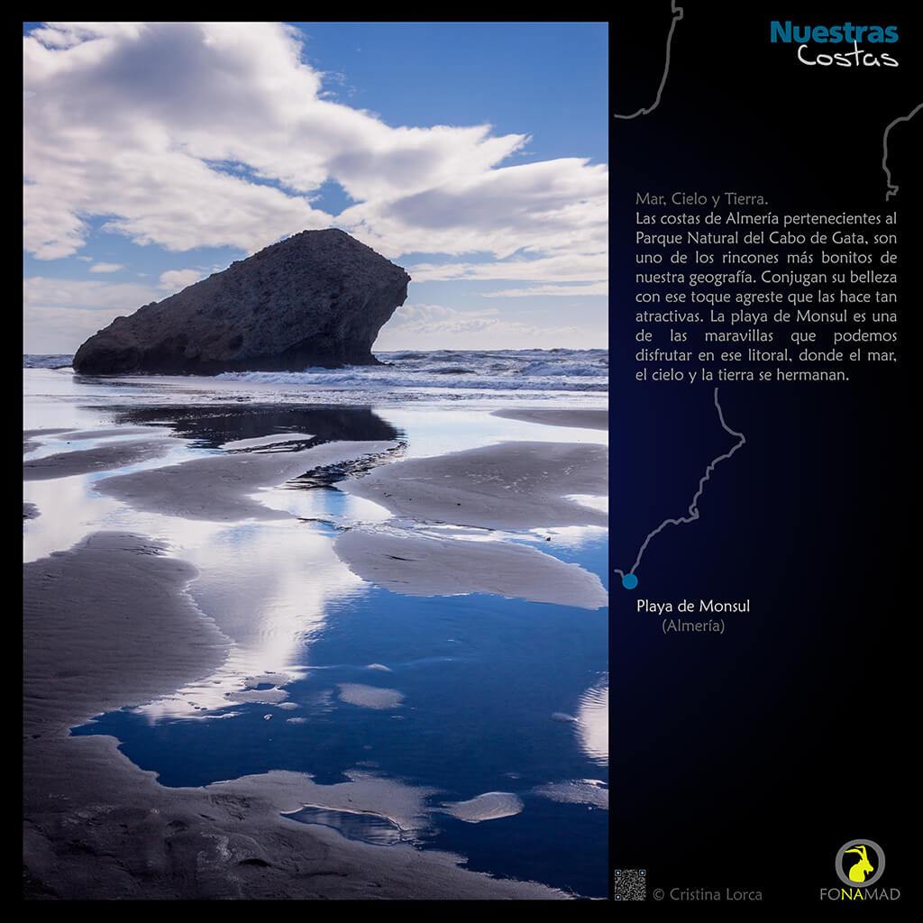 FONAMAD presenta treinta miradas diferentes sobre nuestras costas en las que se ha obviado la huella del hombre y las amenazas de su codicia. Es deliberado, estas fotografÌas no son una denuncia. Son una reivindicación de lo que tenemos, de lo que no queremos perder, de lo que deberíamos conservar. Treinta escenarios del litoral español en los que el mar y el viento construyen un paisaje vivo anclado en lo más profundo de nuestra memoria. Esa magia, que solo la luz es capaz de derramar, se traduce en una infinita paleta de colores que van desde los rojos ígneos del amanecer a los dorados instantes de una cálida mañana transitando hasta los profundos azules con los que se despide el día. Luces que perfilan, que dibujan, que proyectan sombras alargadas, que juegan a esconderse en el misterio del claroscuro. Ambientes oníricos que se despliegan ante nuestra atónita mirada cuando la luz se filtra a través de la niebla o el dosel de hojas de un bosque en otoño, que brilla y se refleja en el agua que como un prisma disgrega la luz en su arcoíris esencial. Os invitamos a recorrer esta exposición con los ojos bien abiertos y el alma receptiva a dejarse llevar por el viento para sobrevolar las visiones tan diversas que componen este recorrido por algunos de los fenómenos más impresionantes, sutiles o misteriosos que nos brinda la Naturaleza.